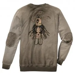 Cotton sweater for all seasons. With motif on the chest and back. Elbow patches with a scattering of nicky holes, front patches with ragged edges, ripped and cut details add a smarter look that simulates natural wear and fray. Colour blue. Material: 100 % cotton.