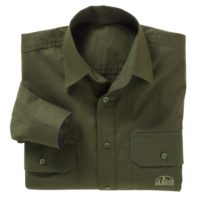 A dark green shirt with 2 button down breast pockets. Material: 100% cotton.