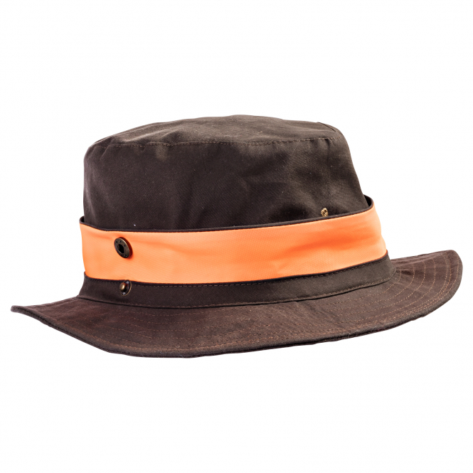 Hunting hat with warning function by opening the push buttons. With embroidered logo. Colour: olive/orange. Upper material: 65% polyester, 35% cotton, lining: 100% polyester.