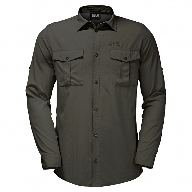 Modern shirt with 2 chest pockets and attachment for rolled up sleeves. Color: dark moss. Material: 100 % polyamid.