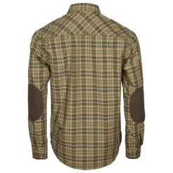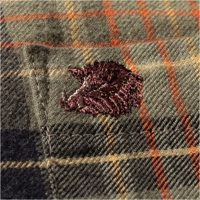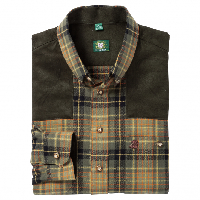 Modern men’s shirt with button-down collar. Set-off shoulder and sleeve sections are both fashionable and functional. Button-down breast pockets. With embroidery of a wild boar on the breast pocket. Colour: olive. Material: 100% cotton.