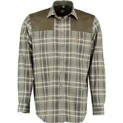 Traditional shirt in high quality. The contrasting sleeves and shoulders are a real eye-catcher. Buttoned breast pockets. An embroidery of a wild boar completes the good impression. With button-down collar. Colour: olive. Material: 100 % cotton.