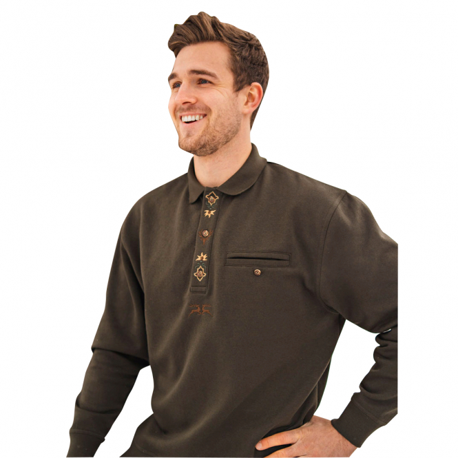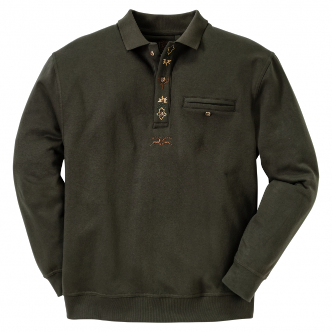 Traditional sweatshirt with polo collar and embroidery on the button placket. Material: 60% polyester, 40% cotton.