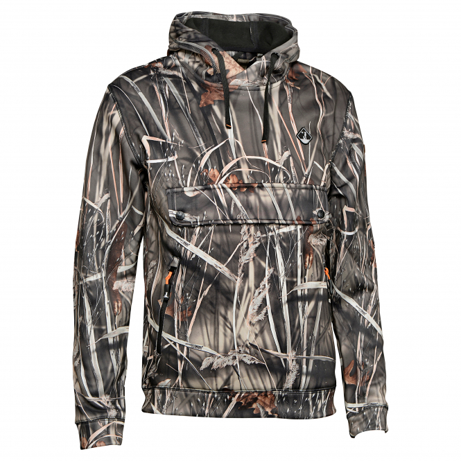 Comfortable and warm due to soft fleece material. With kangaroo pocket, 2 pockets with zipper and hood adjustable by Kordel. Color: ghostcamou wet. Material: 100% polyester.