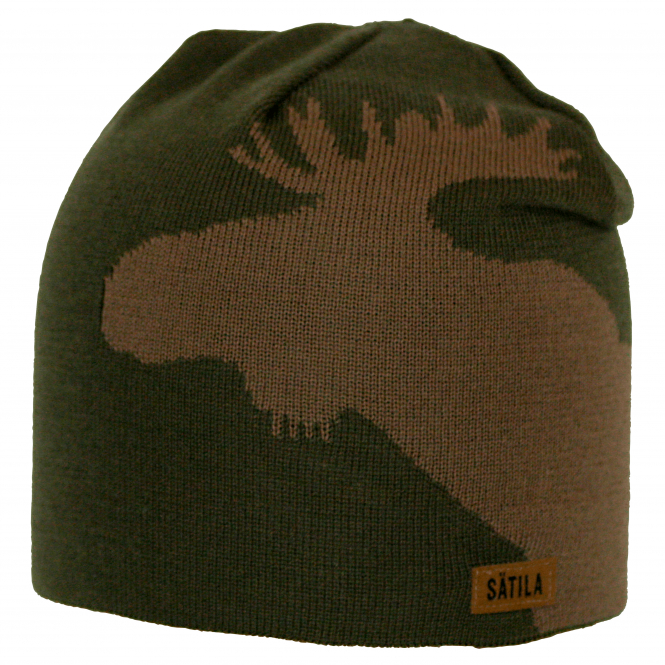 Beanie with taupe coloured deer motif. Colour: green. Material: 50% wool, 50% polyacryle.