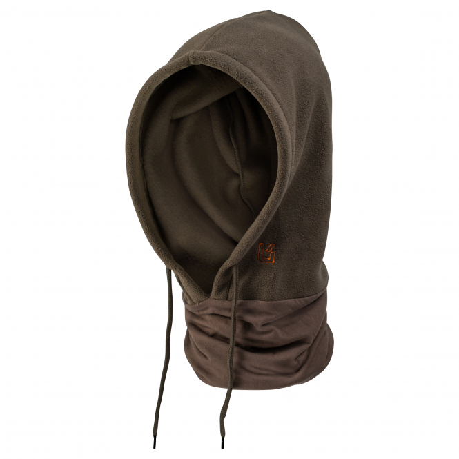 Warm polar fleece hood that can be worn as a neck warmer, hood and balaclava. One size fits all. Colour: brown. Material: 80 % polyester, 20 % cotton.
